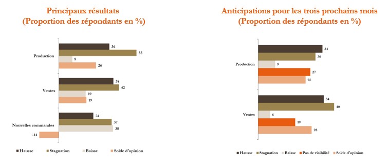 Pour leur part, les ventes auraient augmenté dans l’ensemble des branches à l’exception du « textile et cuir » où elles auraient plutôt reculé. Par destination, les ventes auraient progressé aussi bien sur le marché local qu’étranger.