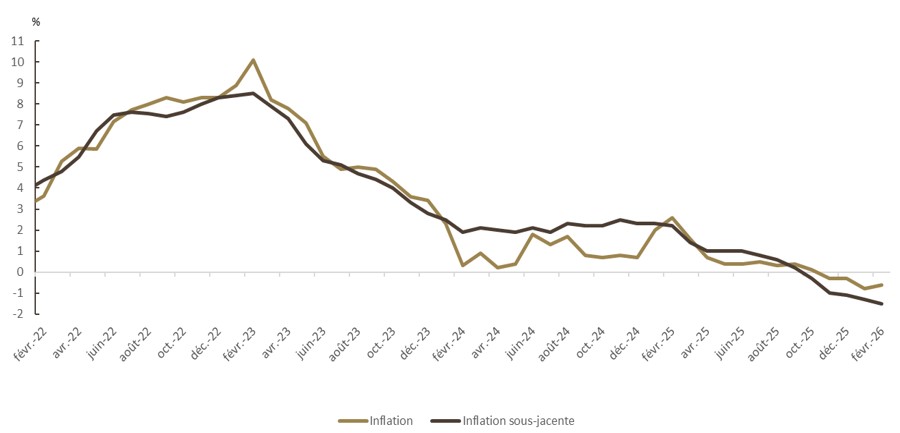 En variation annuelle, l’inflation s’est établie à -0,6%, après -0,8% en janvier et sa composante sous-jacente1 s’est stabilisée à -1,5% durant les deux premiers mois.