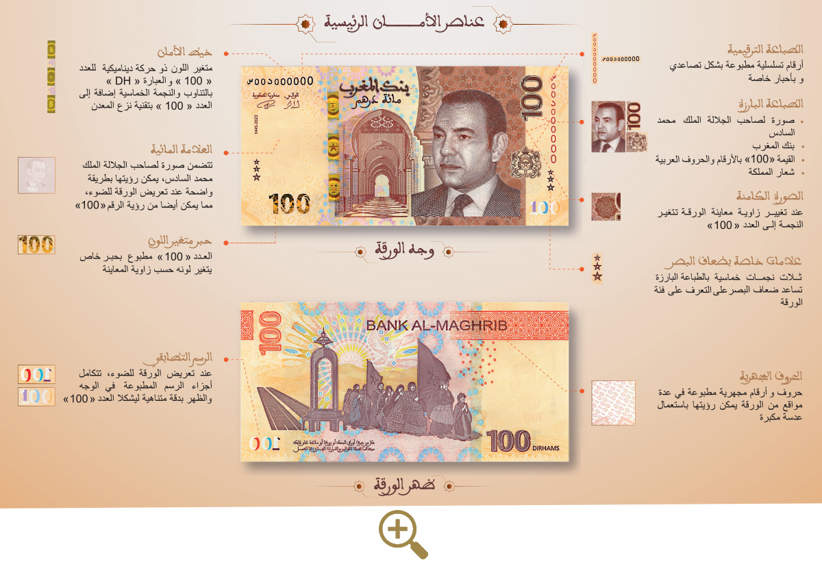 - العلامات المائية: صورة لصاحب الجلالة الملك محمد السادس والعدد « 100 »