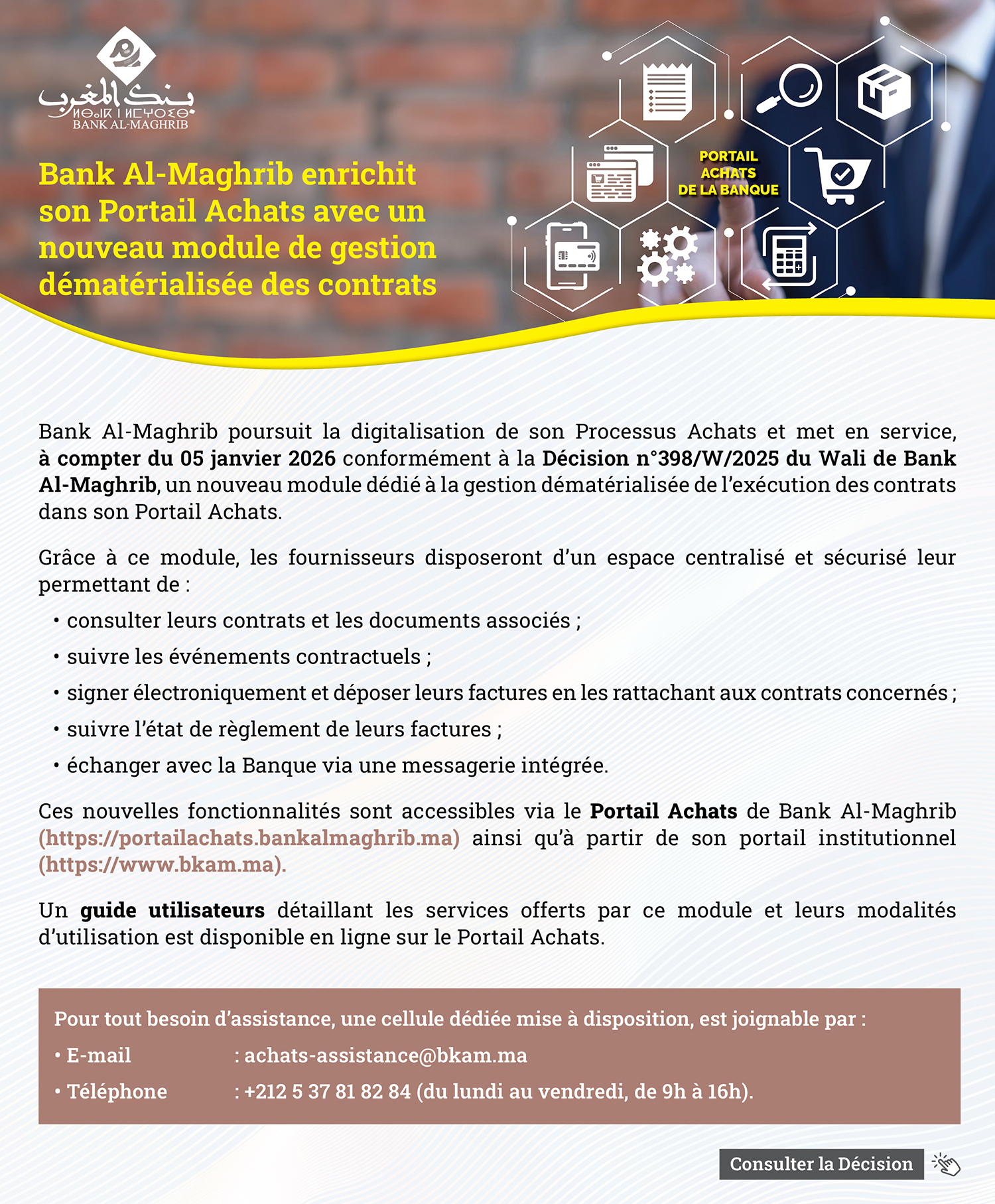 Bank Al-Maghrib enrichit son Portail Achats avec un nouveau module de gestion dématérialisée des contrats