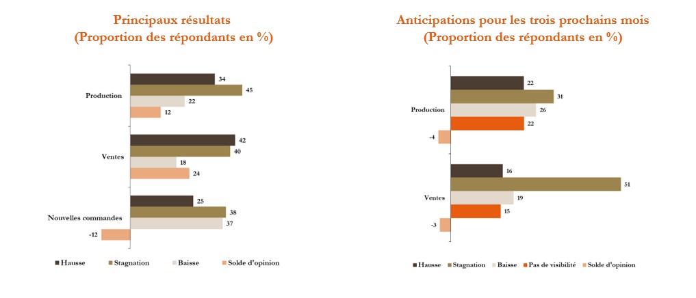 Concernant les ventes, les entreprises prévoient une stagnation dans toutes les branches hormis la « chimie et parachimie » où elles anticipent une baisse.
