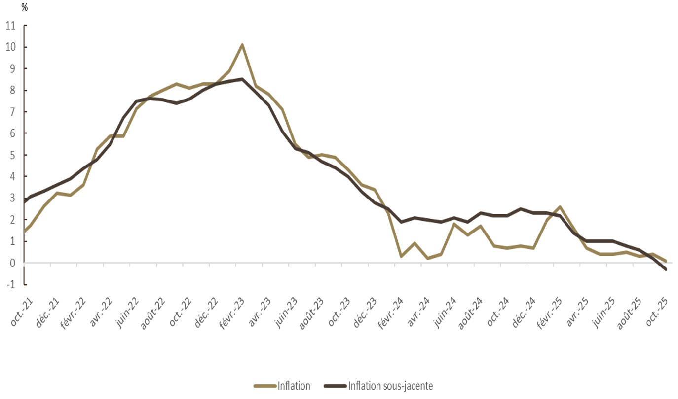 En variation annuelle, l’inflation s’est établie à 0,1%, au lieu de 0,4% en septembre, ramenant sa moyenne au cours des dix premiers mois de l’année à 0,8%. Sa composante sous-jacente1 est ressortie à -0,3% après une hausse de 0,2% un mois auparavant. Le repli de l’indicateur de l’inflation sous-jacente, à son niveau le plus bas depuis janvier 2010, traduit essentiellement la baisse des prix des produits alimentaires qui y sont inclus de 2,1% au lieu de 0,9%, sous l’effet en particulier de la diminution de 10,8% des prix des « huiles ».