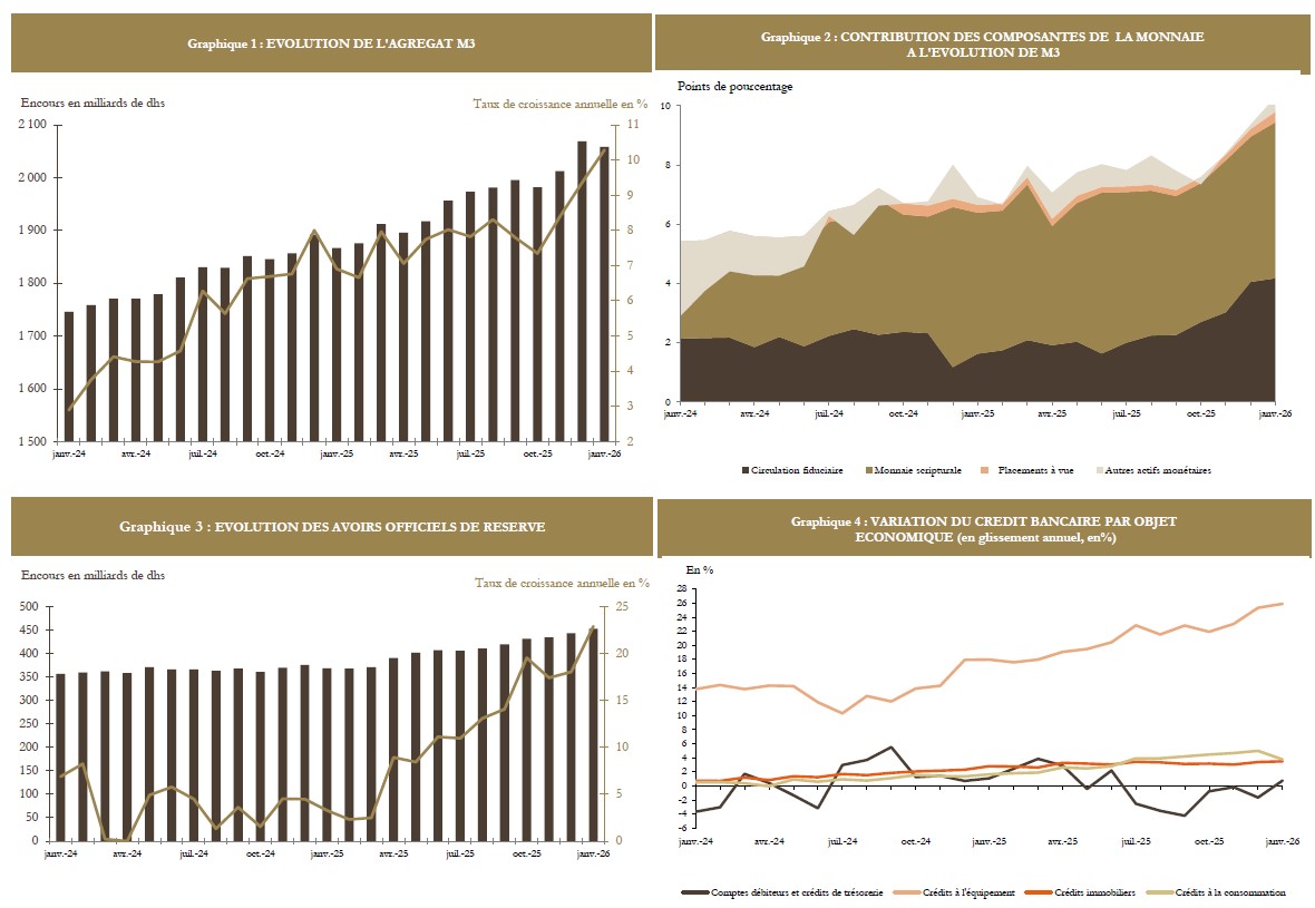 En janvier 2026, la masse monétaire a marqué un accroissement annuel de 10,3% après 9,4% le mois dernier pour atteindre 2 058,4 MMDH. Cette évolution traduit principalement :